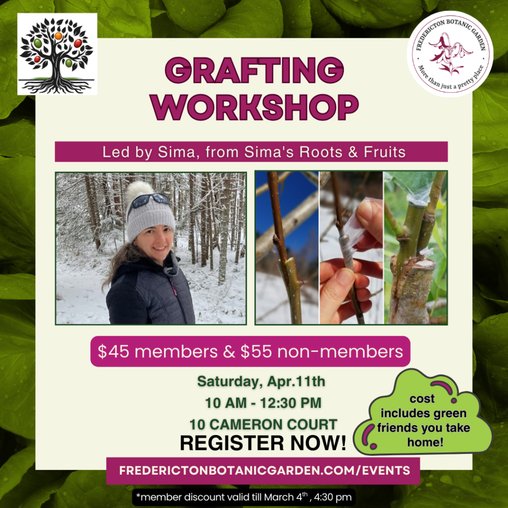 We are very excited to offer a grafting workshop at the Fredericton Botanic Garden! Join us on Saturday, April 11th at 10 am until 12:30 pm. The workshop will be led by Sima, from Sima’s Roots & Fruits. We will focus on cleft grafting, and will practice our new knowledge by grafting a new baby fruit tree, as well as fruit trees at the food forest. Best part? You get to take your baby tree home with you! All tools will be provided.