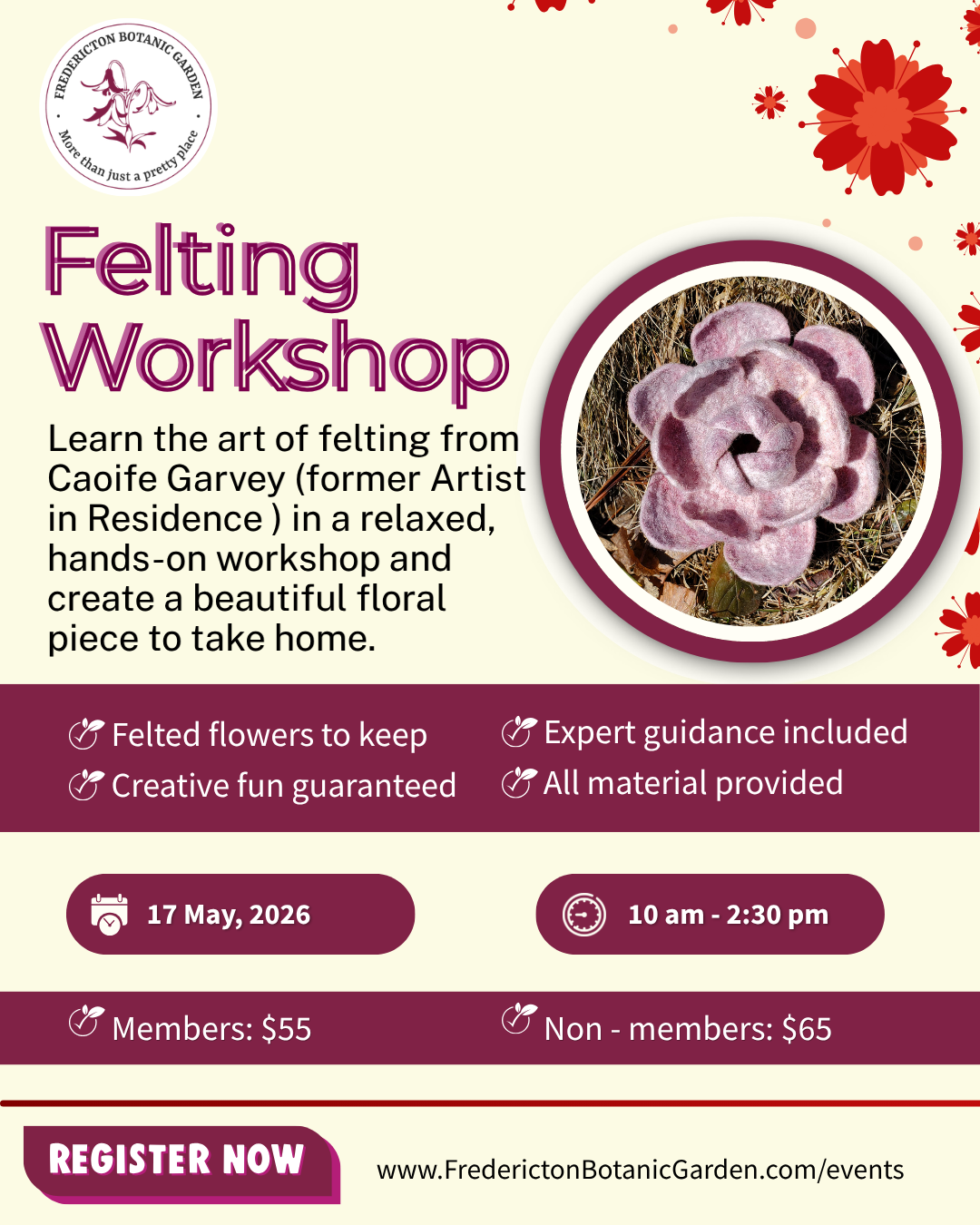 Join us for a creative and relaxing Felting Workshop with Caoife Garvey, former Artist in Residence at the Fredericton Botanic Garden. In this hands-on workshop, Caoife will guide participants through the art of felting as you create your own beautiful floral piece. Whether you are new to felting or have some experience, this workshop is […]