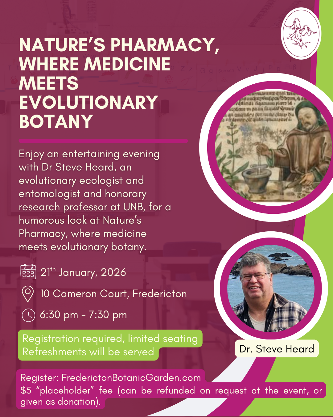 Enjoy an entertaining evening with Dr Steve Heard, an evolutionary ecologist and entomologist and honorary research professor at UNB, for a humorous look at Nature’s Pharmacy, where medicine meets evolutionary botany.