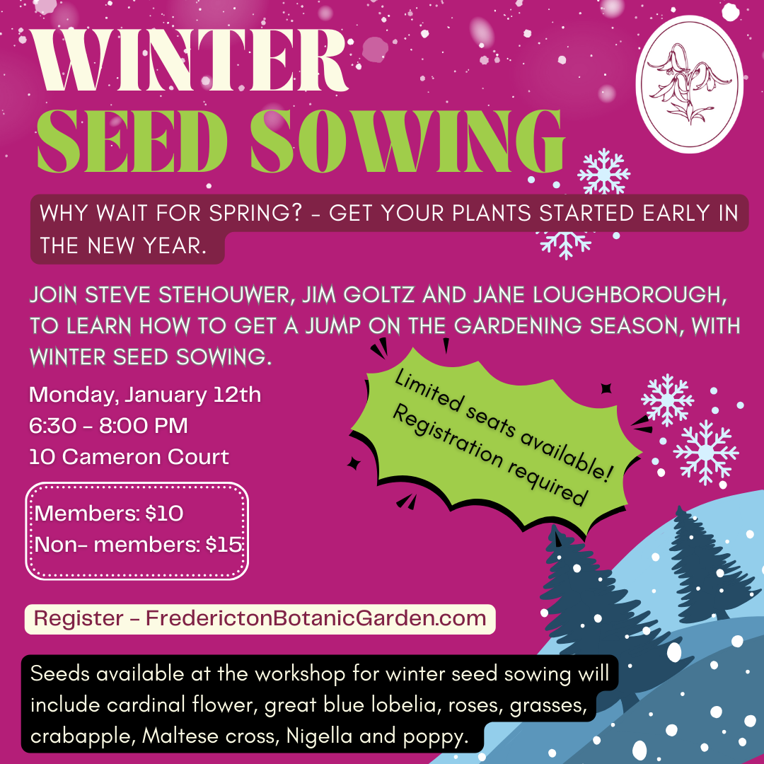 10 Cameron Court, Fredericton Botanic gardenWhy Wait for Spring? - Get your plants started early in the New Year. Join Steve Stehouwer, Jim Goltz and Jane Loughborough, at 6:30 pm, on Monday, January 12th, at the Resource Centre to learn how to get a jump on the gardening season, with Winter Seed Sowing. Participants are encouraged to bring their own seeds (extras, […]